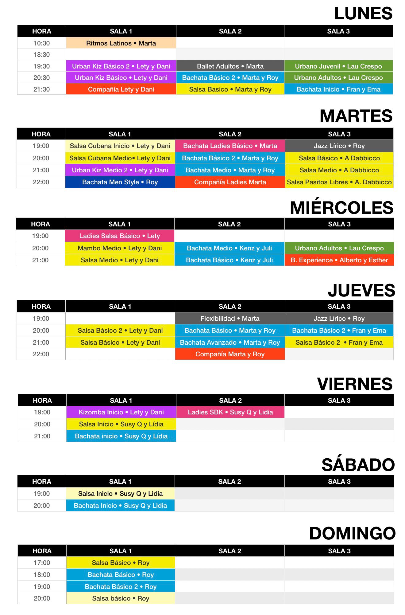 | 21:00 | SALSA PAREJAS INICIO 2- LETY Y DANI | BACHATA MEDIO AVANZADO - MARTA Y ROY | SALSA PAREJAS BÁSICO- FRAN Y EMA | |||||||||